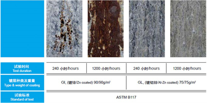 | 為由鋁鋅合金包裹的合金鋼,其防腐及抗氧化能力較之前的熱鍍鋅要翻一倍 |