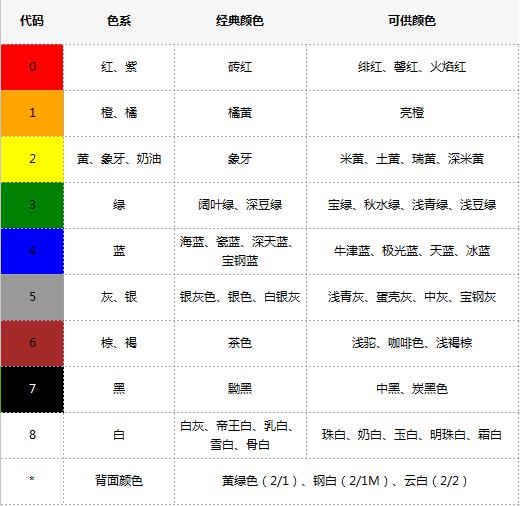 海藍、白灰、象牙白、磚紅、瓷藍、豆綠、深豆綠、潔面灰、淺青灰、深藍、亮藍、緞灰、鉛灰、碳黑、