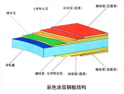 彩鋼板的構(gòu)成:基板+化學處理層+底漆+面漆。