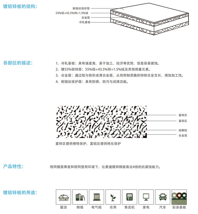 鍍鋁鋅光板由55%鋁、 43.4%鋅與1.6%硅在600℃高溫下凝固而組。鍍鋁鋅表面呈特有的光滑、平坦和華麗的星花,基色為銀白色。特殊的鍍層結構使其具有優(yōu)良的耐腐蝕性。鍍鋁鋅板正常使用壽命可達25a,耐熱性很好,可用于315℃的高溫環(huán)境;鍍層與漆膜的附著力好,具有良好的加工性能,可以進行沖壓、剪切、焊接等;表面導電性很好。