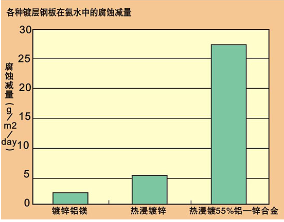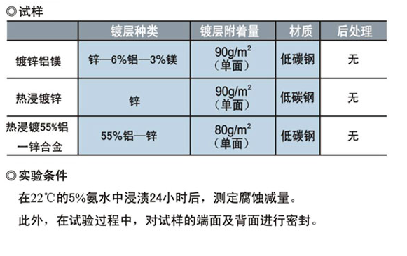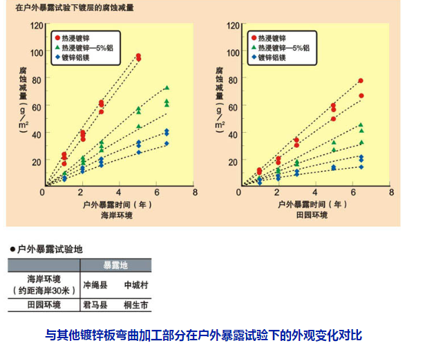 約7年的暴露結(jié)果表明,鍍鋅鋁鎂鋼板比熱浸鍍鋅鋼板的耐蝕性約高4倍。隨著時(shí)間的推移,鍍鋅鋁鎂鋼板比其他鍍層鋼板出現(xiàn)的腐蝕減量下降,因此鍍鋅鋁鎂鋼板與其他鍍層鋼板的耐蝕性差距將會(huì)進(jìn)一步拉大。