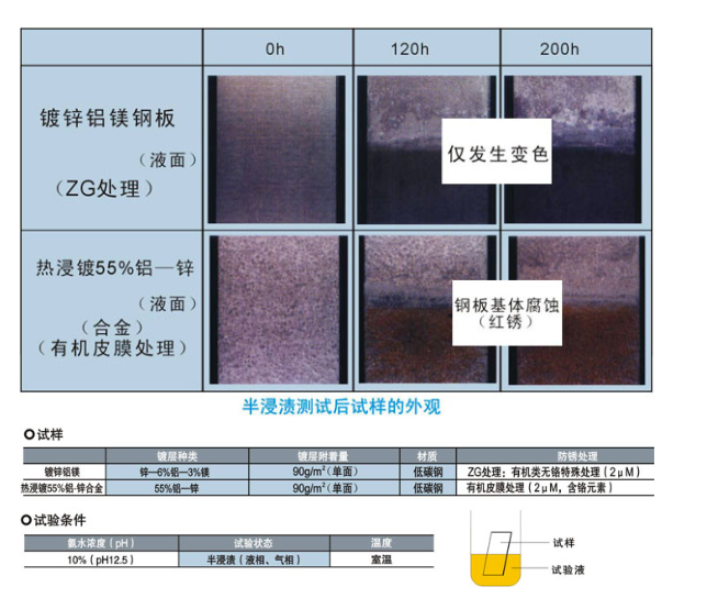 但作為面板表面等使用時(shí)的“耐紅銹性”,鍍鋅鋁鎂鋼板極為優(yōu)異。抗腐蝕非常強(qiáng)的鋁的耐腐蝕性,也是由其表層的不動(dòng)態(tài)皮膜所實(shí)現(xiàn)的。但是,鋁具有對(duì)“堿”較弱的性質(zhì)。