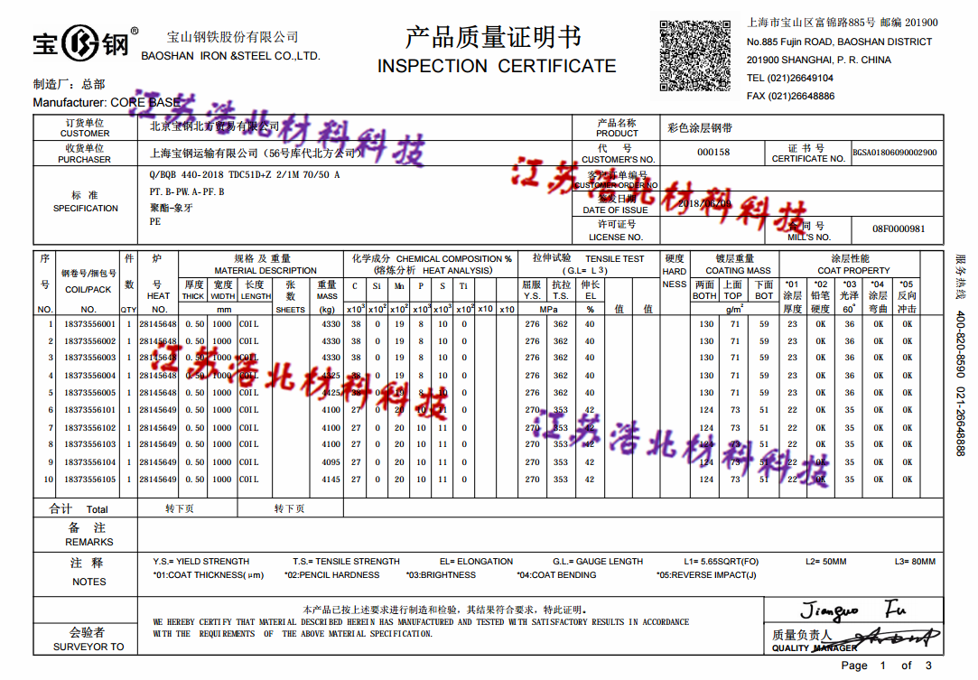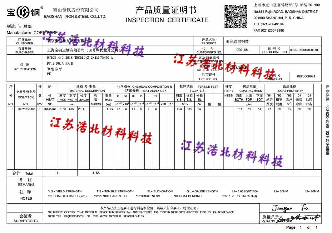 寶山鋼鐵股份產(chǎn)品質(zhì)量保證書無憂訂購